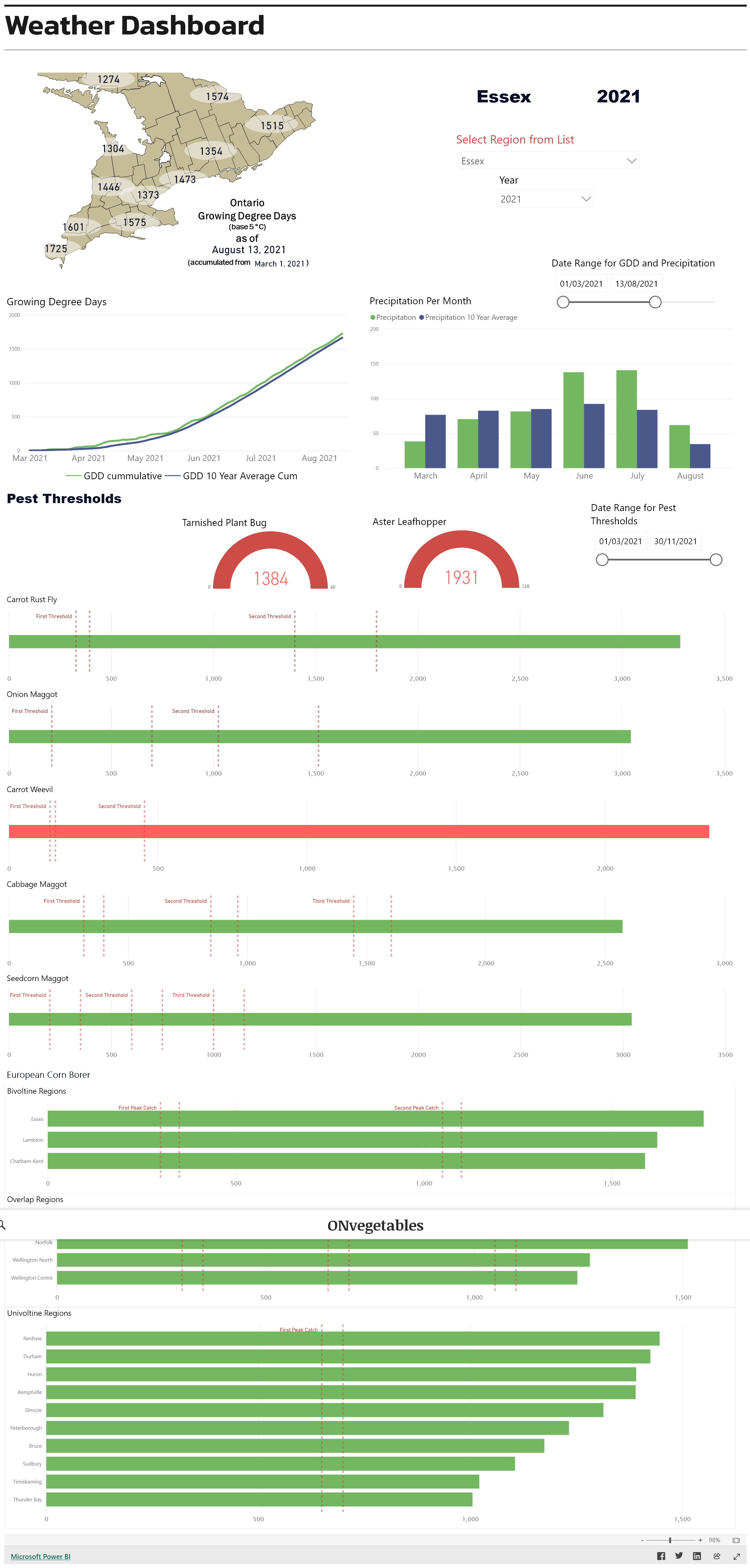 Climate and pest trend dashboard created with Microsoft Power BI for the Ontario Ministry of Agriculture, Food and Agribusiness extension blog ONVegetables (2020, updated in 2022). Click here to view and interact with the dashboard on the blog.